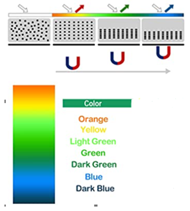 Quando um campo magnético é aplicado sobre o Magview ou Visualizador de Campo magnético as partículas magnéticas reúnem-se e alinham-se com as linhas de fluxo magnético que emanam da fonte magnética, isso faz com que se forme uma imagem escura no filme. Caso haja mais de um polo a imagem formada será de duas ou mais regiões escuras delimitadas por uma linha clara (ver figuras), e assim quanto maior o número de polos, maior será o número de regiões delimitadas por uma linha branca. Quando o filme é removido da presença do campo magnético as partículas ficam livres novamente apagando assim a imagem.